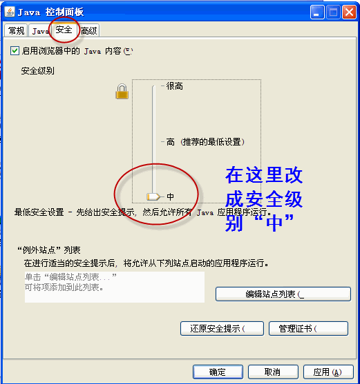 java设置程序出来之后,选安全选项卡Tab,然后把安全设置为“中”,点确定,再点我们java动画按钮。